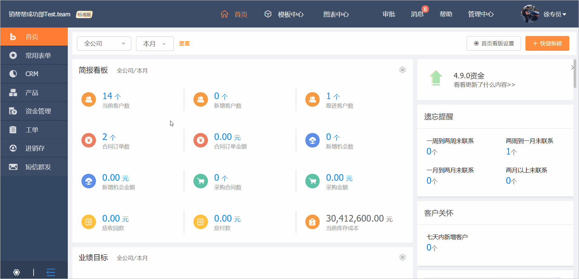 销帮帮的资金管理解决了多种场景问题:合同回款、合同应收未收款记录、预收款、退款、坏账、资金往来等。